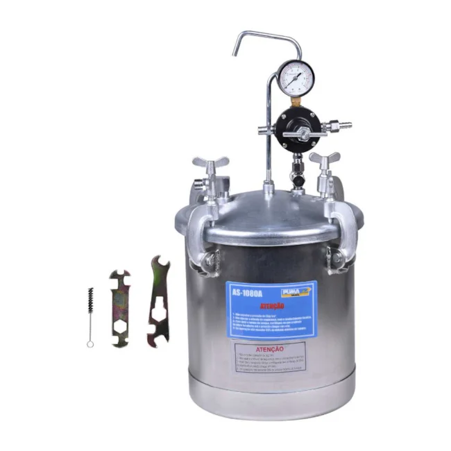 – Entrada de Ar: 1/4″ (M); – Capacidade: 10 litros; – Pressão de Trabalho: 5 a 30 PSI; – Tipo: Tanque de Pintura; – Modelo: AS-1080A; – Marca: PUMA.